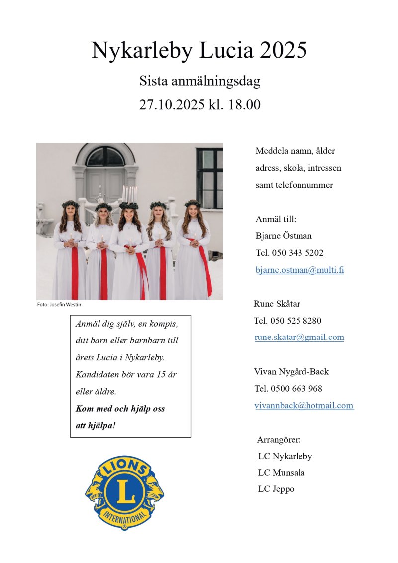 Lions söker luciakandidater för årets Lucia 2025. Anmäl intresse och hjälp Lions hjälpa. -------------------------------------------------------------------------------------------------------------------------------------------------------- Reklam förmånligt i Nykarleby centrum. Ta kontakt med styrelsen!