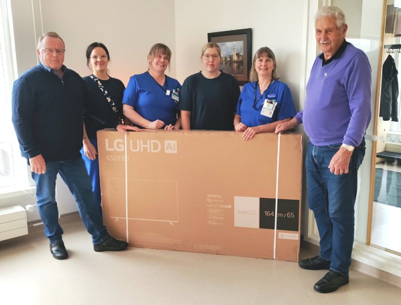 LC Nykarleby, LC Munsala och LC Nykarleby Ålvor donerade en TV till HVC bäddavdelning den 8.10.2025. Från vänster på bild Johan Lillqvist, Malin Wiklund, Maria Storskrubb, Pia Saari, Regina Jaskari och Rolf Asplund.