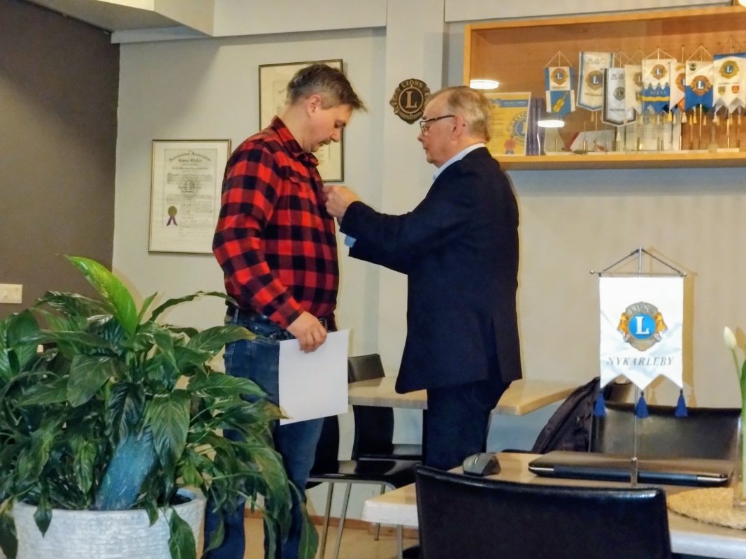 På månadsmötet den 12.03. intogs Rolf Sjöskog som medlem i KC Nykarleby. På bilden får han lionsmärket av president Markku Ranta. |